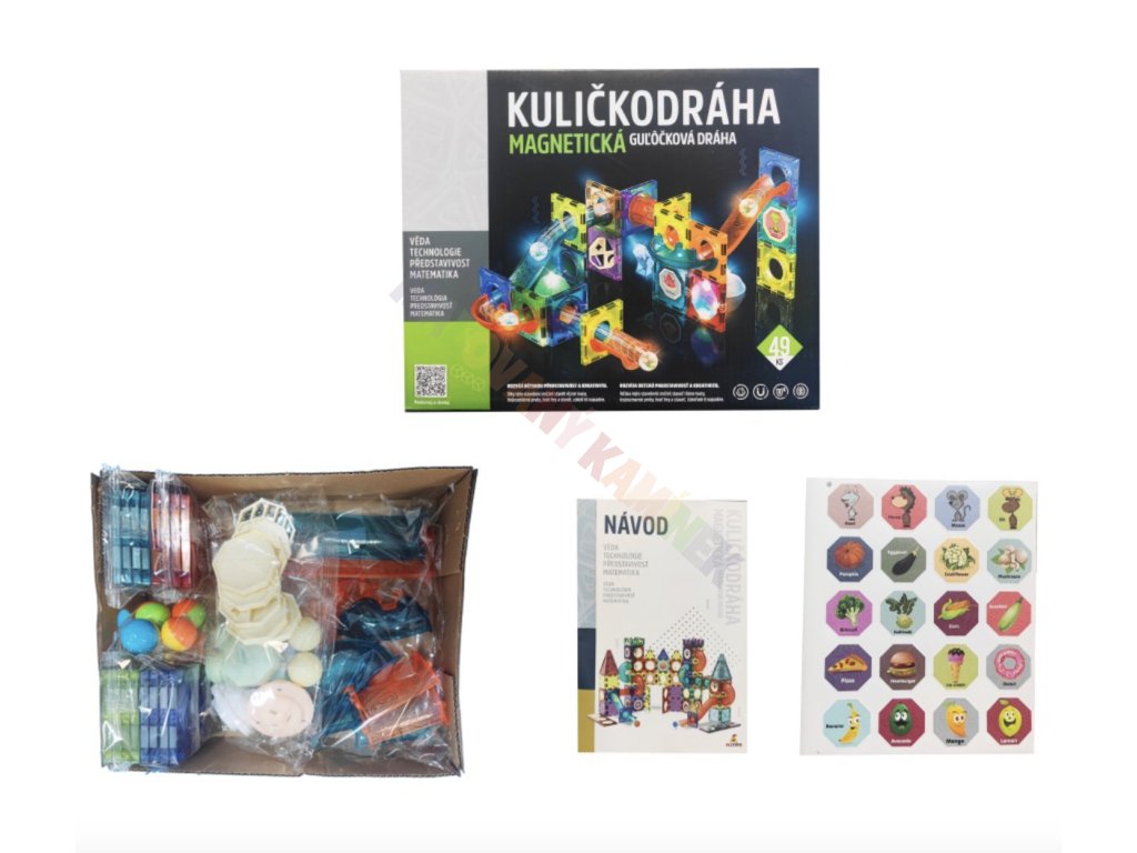 - Obsah balení: 49 dílků, včetně barevných magnetických částí a svítících kuliček.