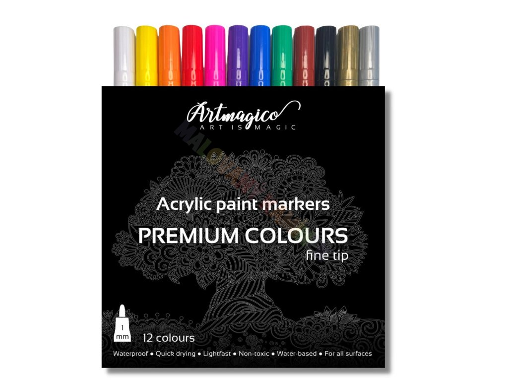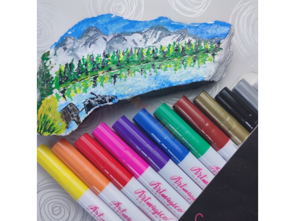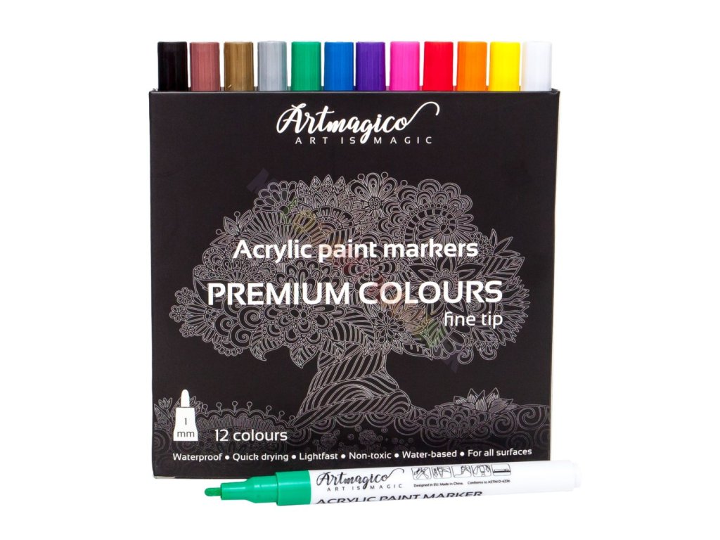 Akrylové fixy zn. Artmagico s jemným hrotem o šíři 1 mm a inkoustem prémiové kvality nabízíme v sadě 12 ks. Skvělou paletu barev, nejkvalitnější hrot a dokonale krycí inkoust v lesklých barvách si oblíbí každý umělec! Luxusní akrylové fixy Artmagico jsou velmi oblíbené zejména pro malování na kamínky. Artmagico nabízí fixy nejvyšší kvality v elegantním designu. Plynulý tok barvy zajišťuje kvalitní inkoust na vodní bázi. Inkoust je rychleschnoucí, trvalý, bez zápachu a zároveň netoxický. Barvy zůstávají po uschnutí hladké, lesklé a neprůhledné na všech typech povrchů. Hroty popisovačů Artmagico jsou ideální na detailní práci i vymalování menších ploch. Díky kombinaci vlastností popisovačů Artmagico budou Vaše výtvory vždy dokonalé.