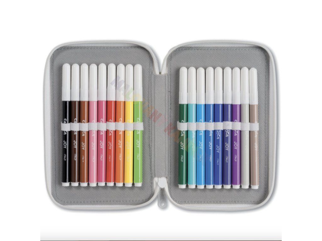 - Obsah: 18 fixů, 18 barevných pastelek, 1 grafitová tužka HB, 1 pravítko, 1 guma, 1 ořezávátko, 1 lepidlo, 2 kuličková pera a 1 gumovací pero