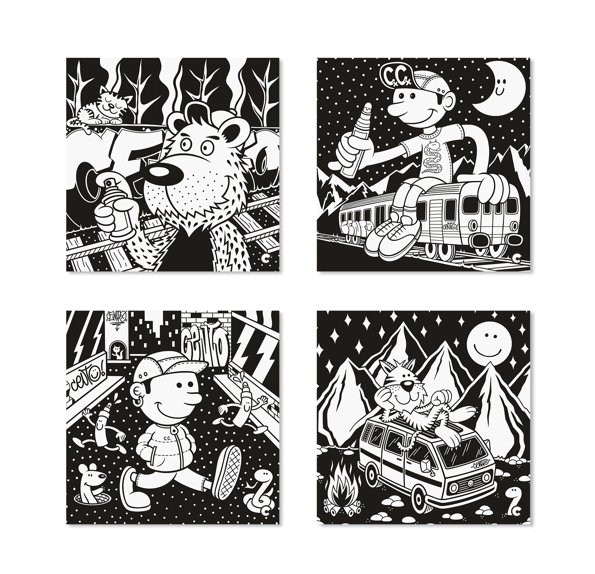 Zábavné omalovánky značky Carioca obsahují 4 listy k vymalování. Jsou jedinečné tím, že mají černé stránky, které jsou neobvyklé pro dětské omalovánky, lépe rozvíjí fantazii a barvy skvěle vyniknou. Originální design omalovánek navrhl graffiťák a ilustrátor Cento Canesio!
