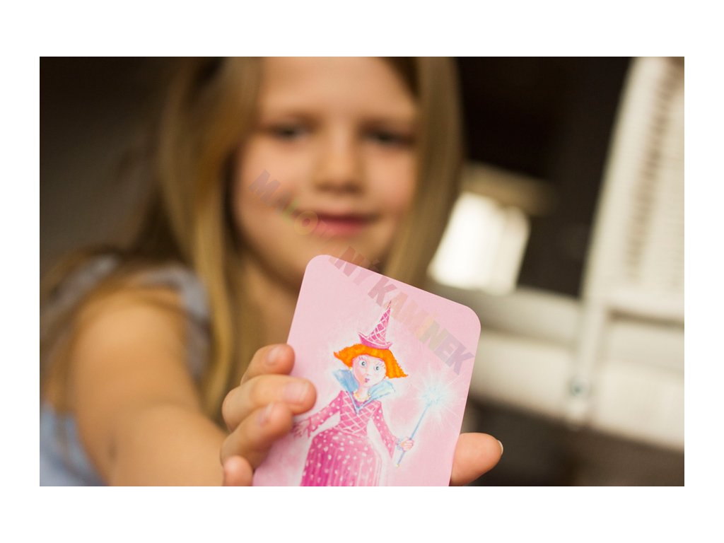 V balení najdete celkem 55 karet rozdělení do čtyř kategorií - čarodějky, víly, diamanty a zámky. Pokud si hráč vylosuje čarodějku, musí ji vrátit a s ní další tři karty nebo kartu víly, která ho zachrání. Za diamantové karty si od hráče kupuje tu část zámku, která mu chybí.