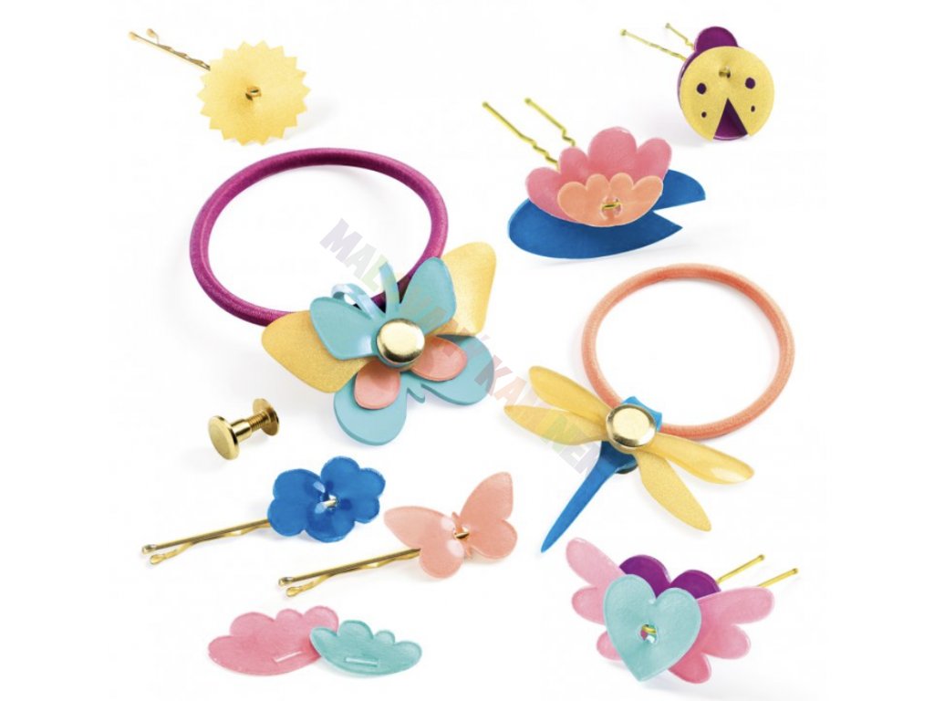 Kreativní sada na výrobu ozdob do vlasů ze smršťovací fólie od značky Djeco umožňuje malým parádivým slečnám vytvořit si vlasové šperky a stát se na malou chvíli designérkami!