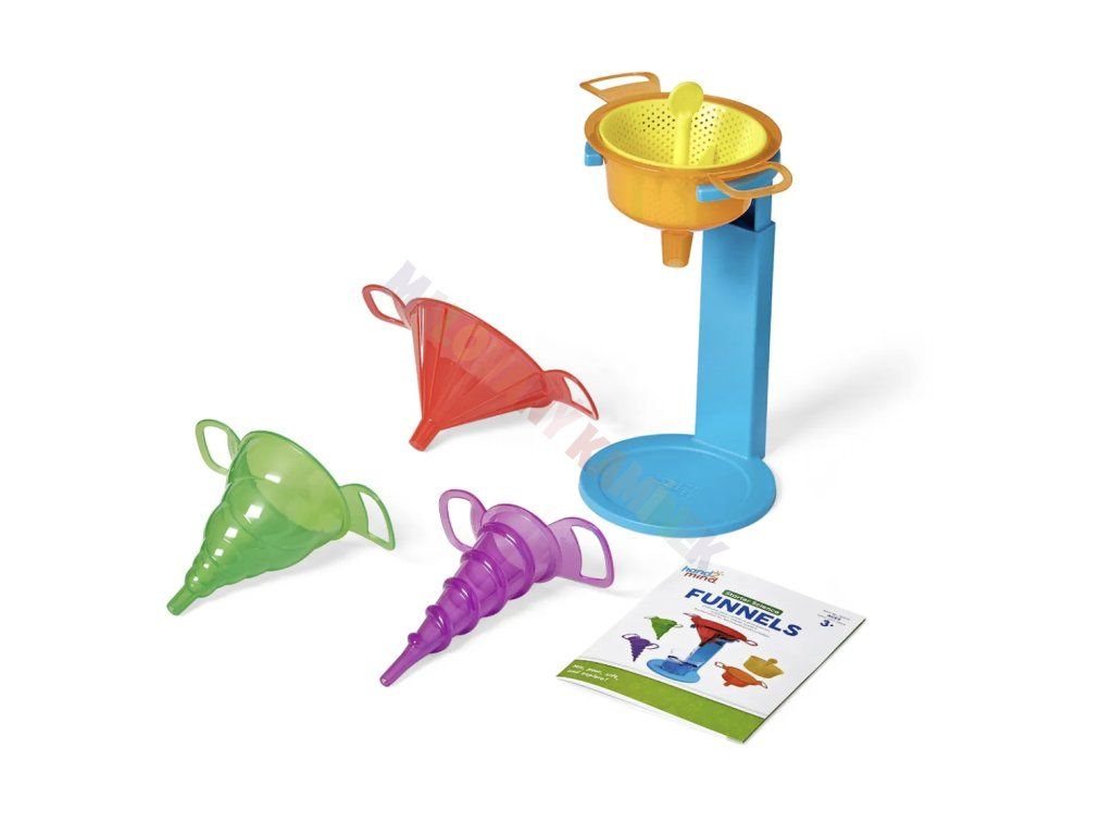 Máte doma malého "míchače", který miluje přelévání všeho do všeho? Tyto vědecké trychtýře jsou upgrade, který si zaslouží! Mají stojánek, takže se nekývají, a jeden má dokonce kouzelné sítko na prosévání pokladů. Ideální parťák pro senzorické hraní.