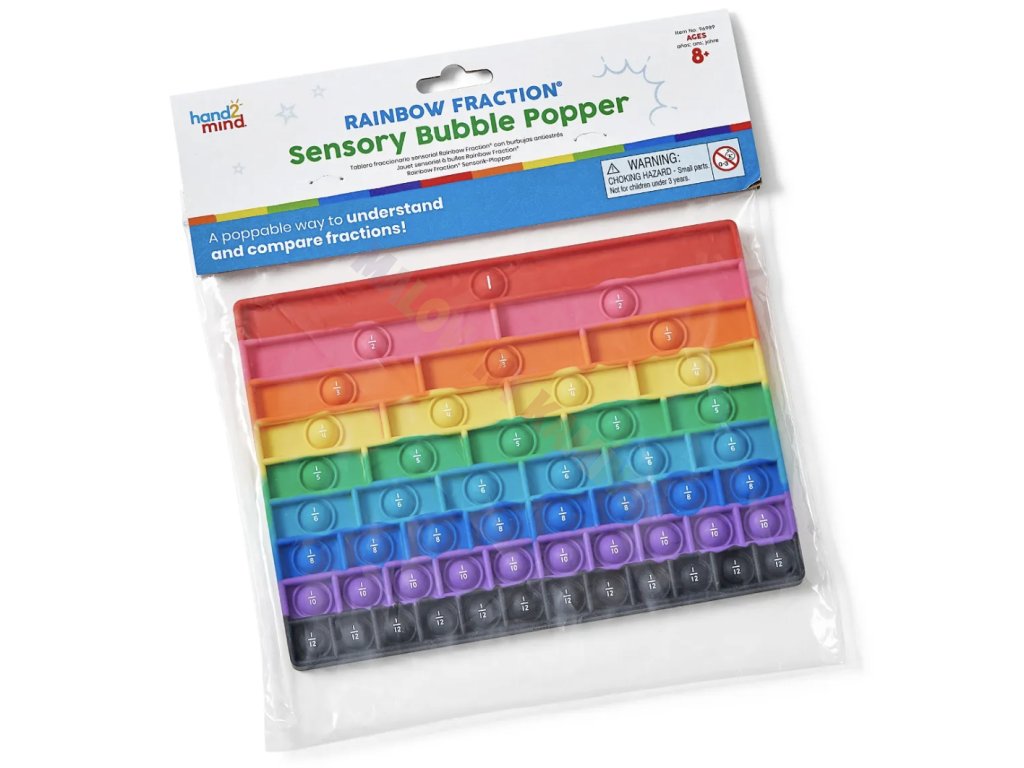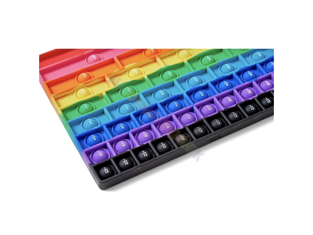 Duhový pop-it pro učení zlomků od Hand2mind je moderní manipulační pomůcka, která převádí abstraktní matematiku do jednoduché, hmatové a zábavné formy. Každá barevná sekce představuje konkrétní zlomek – například poloviny, třetiny, čtvrtiny nebo osminy – a děti mohou díky bublinkám fyzicky sledovat, jak se celek dělí na části.