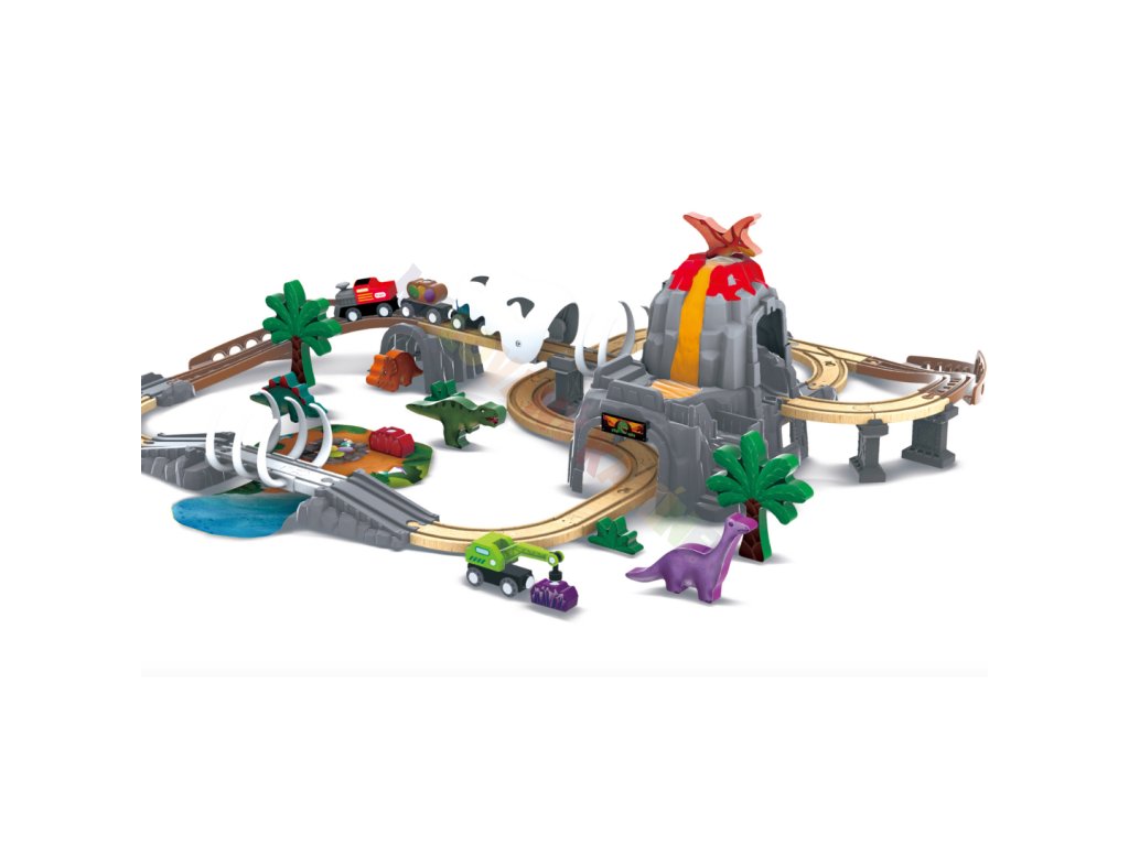 Dinosauří vláčkodráha Adventure Set od Hape přenese děti do doby, kdy po Zemi kráčeli dinosauři. Tato propracovaná vláčkodráha je plná interaktivních prvků, které dělají každé dobrodružství jedinečným – děti mohou projet skrz dinosauří bránu, vyhnout se propadlištím, překonávat překážky a prozkoumávat tajemná zákoutí pravěkého světa.