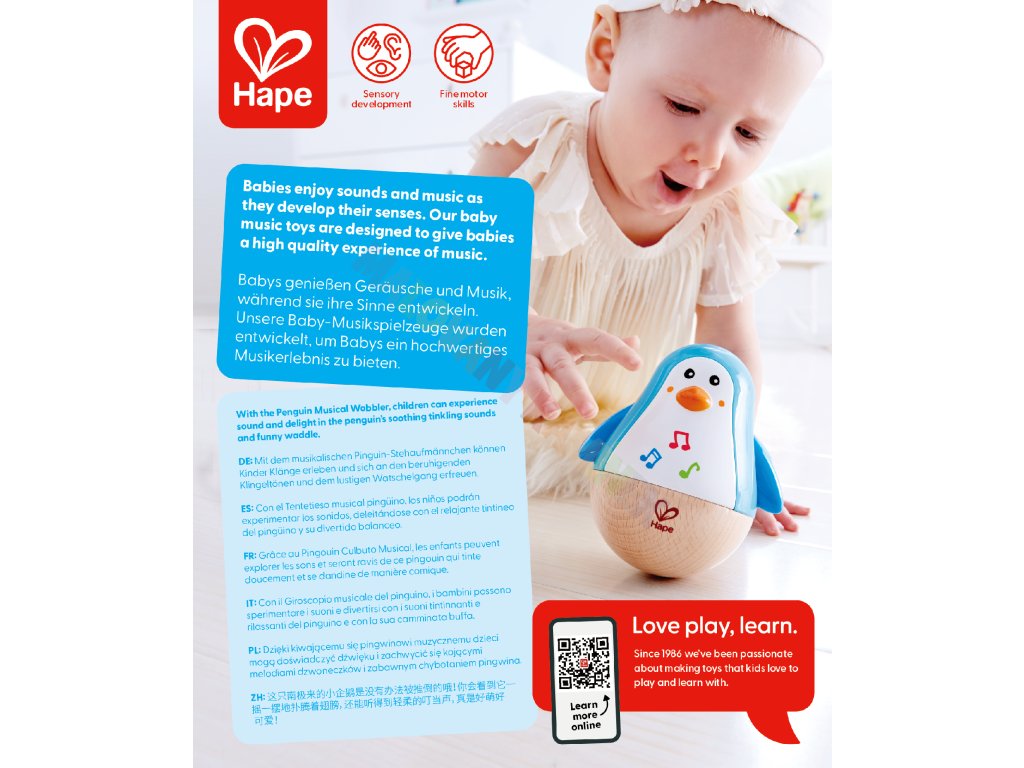 Hape ale nabízí mnohem víc – hudební nástroje, stavebnice, kuchyňky, zvířátka, domečky pro panenky, vše z odolného dřeva a s důrazem na bezpečnost a trvalou udržitelnost.