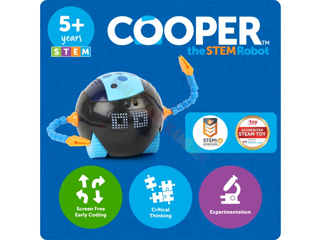 Objevte kouzlo programování s robotem Cooper™, který přináší do výuky zábavné a interaktivní kódování bez obrazovky. Děti se učí základům programování prostřednictvím jednoduchého zadávání příkazů pomocí tlačítek a sledují, jak se jejich kód mění v reálný pohyb.
