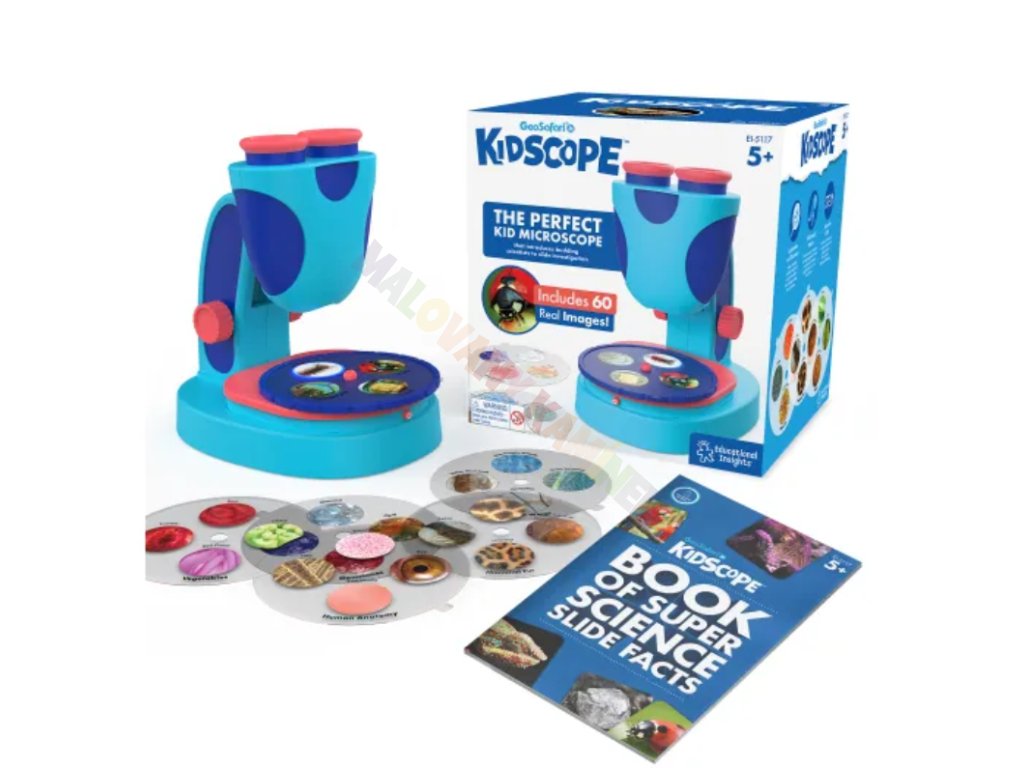 GeoSafari Jr. KidScope je dětský mikroskop, který hravou formou seznamuje malé vědce se světem vědeckého bádání. Obsahuje 15 diapozitivů se 60 vysoce kvalitními obrázky a možnost pozorovat i vlastní předměty.
