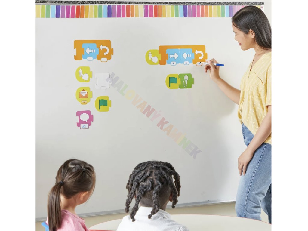 Pomůcka podporuje aktivní zapojení celé skupiny – děti mohou bloky řadit, diskutovat o řešení a společně tvořit jednoduché algoritmy. Hodí se jako doplněk k digitální výuce informatiky i jako samostatná aktivita rozvíjející informatické myšlení.