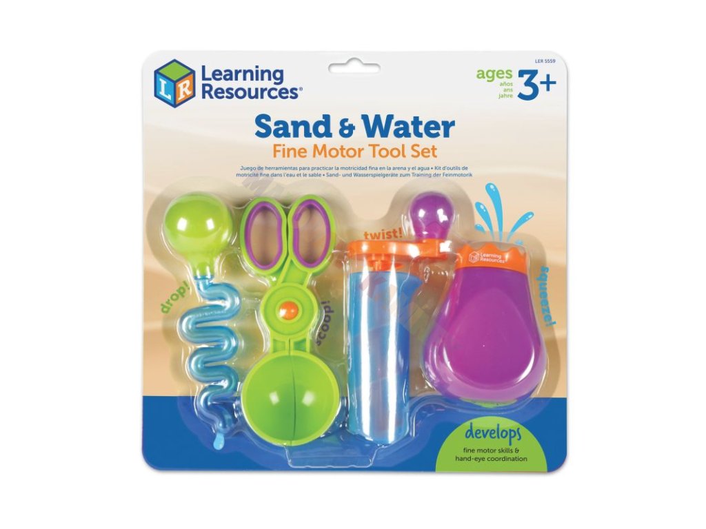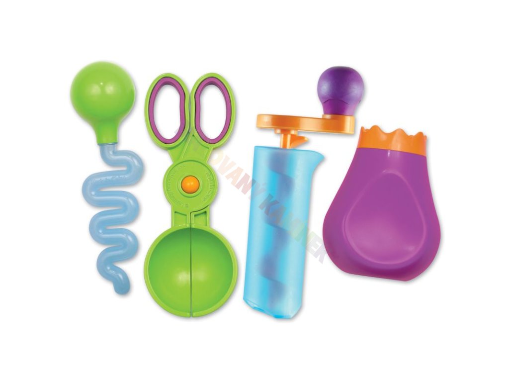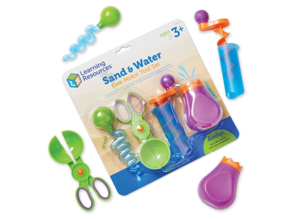 Sada nástrojů pro hru s pískem a vodou, která rozvíjí jemnou motoriku, sílu prstů i kreativitu dětí