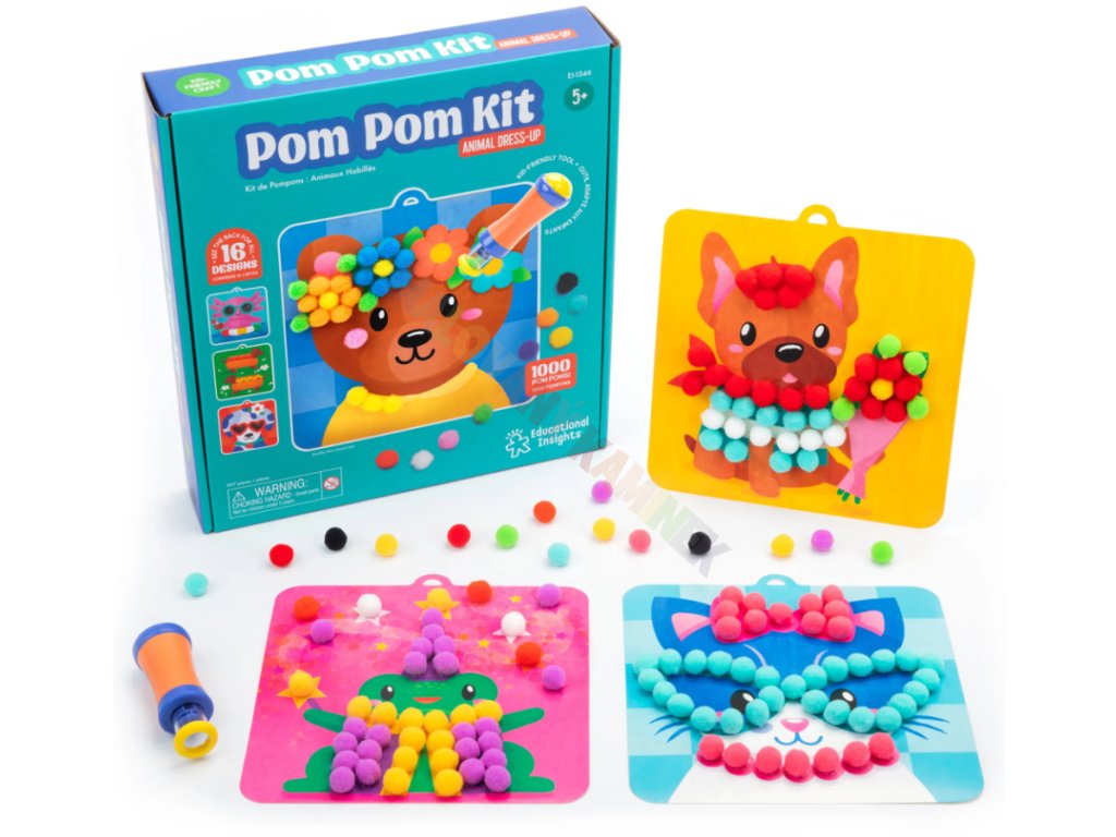 - Obsah balení: Pom-pom nástroj, 16 designových karet se zvířátky, 1000 barevných pom-pomů