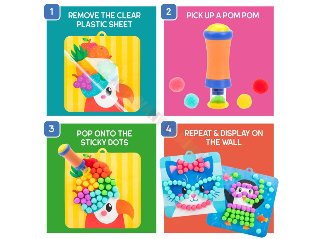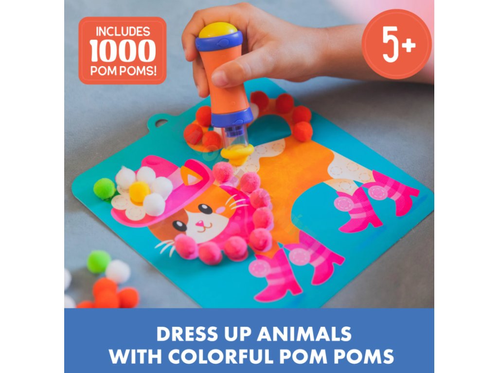 Tento kreativní kit nabízí dětem možnost tvořit 3D obrázky s motivy zvířátek bez použití lepidla. Pom-pom nástroj umožňuje snadné a čisté přichycení barevných kuliček na kartičky.