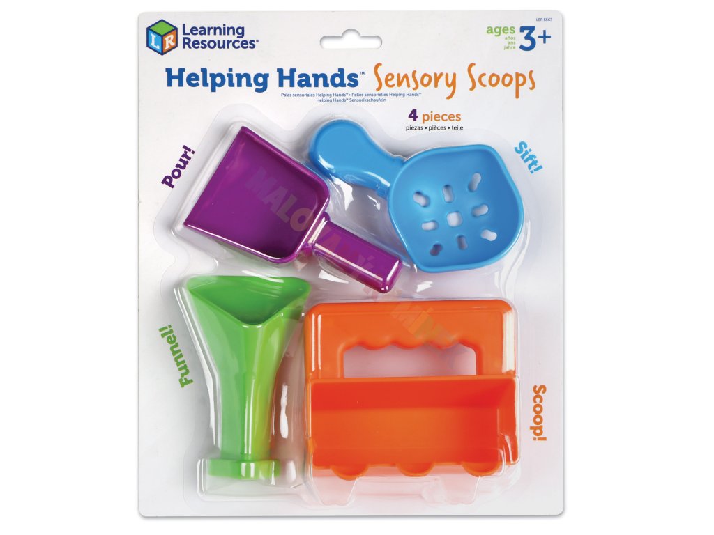Helping Hands Sensory Scoops jsou čtyři barevné nástroje pro sypké materiály, navržené tak, aby podporovaly jemnou motoriku a smyslové zkušenosti u dětí již od 3 let. Každý scoop nabízí jiný způsob manipulace – sypání, prosévání, nalévání či otáčení.