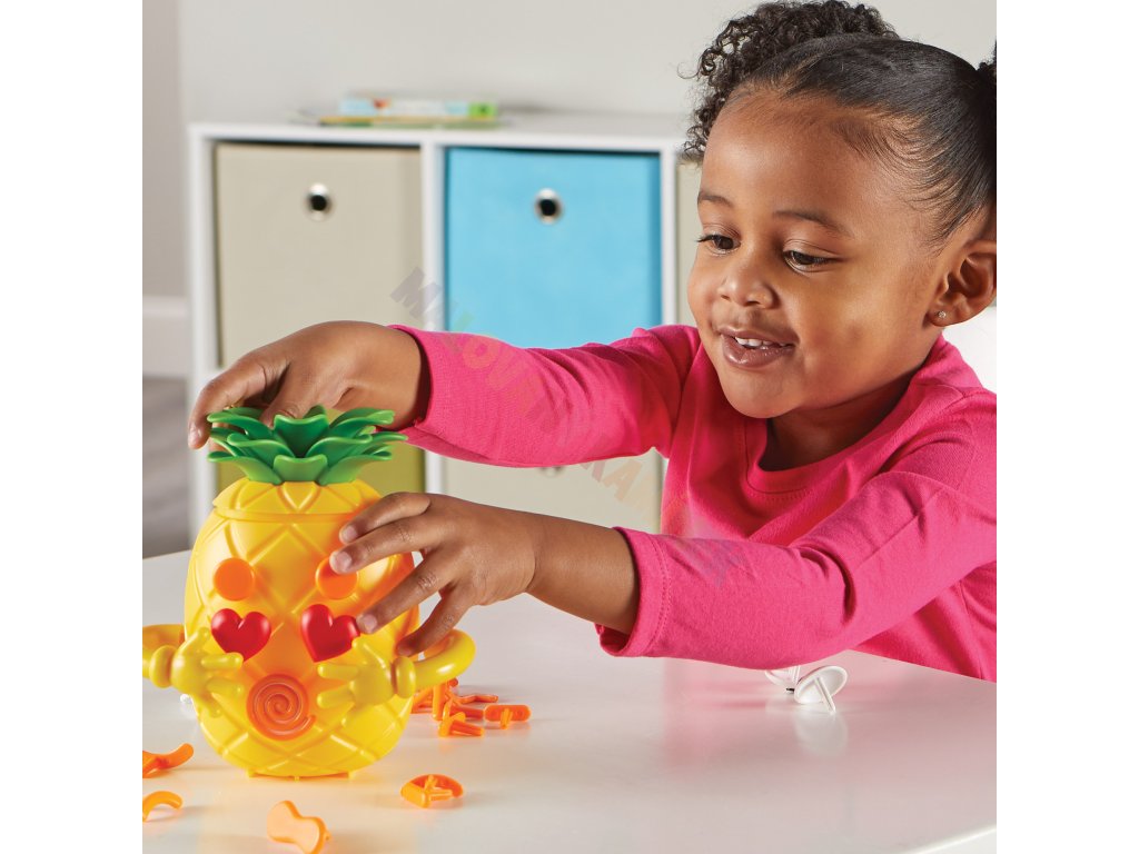 Tato pomůcka podporuje rozvoj sociálně-emočních dovedností a empatie. Děti mohou vytvářet výrazy obličejů podle nálady nebo podle zadání dospělého a následně o emocích diskutovat. Oboustranný design umožňuje zobrazovat kontrastní pocity, například radost vs. smutek. Díly se ukládají přímo dovnitř ananasu, což usnadňuje organizaci a používání doma, ve školce i v poradenském prostředí.