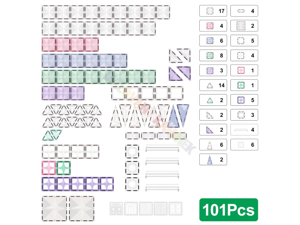- 101 magnetických dílků v pastelových barvách (světle oranžová, růžová, zelená, fialová, modrá, průhledná)