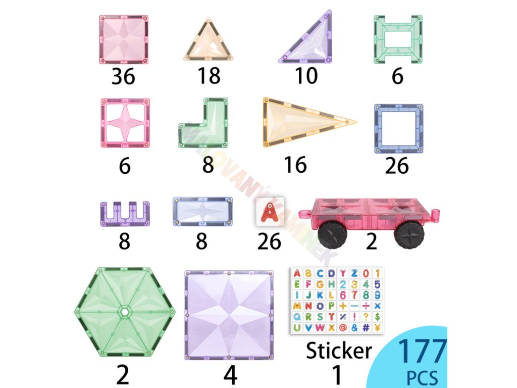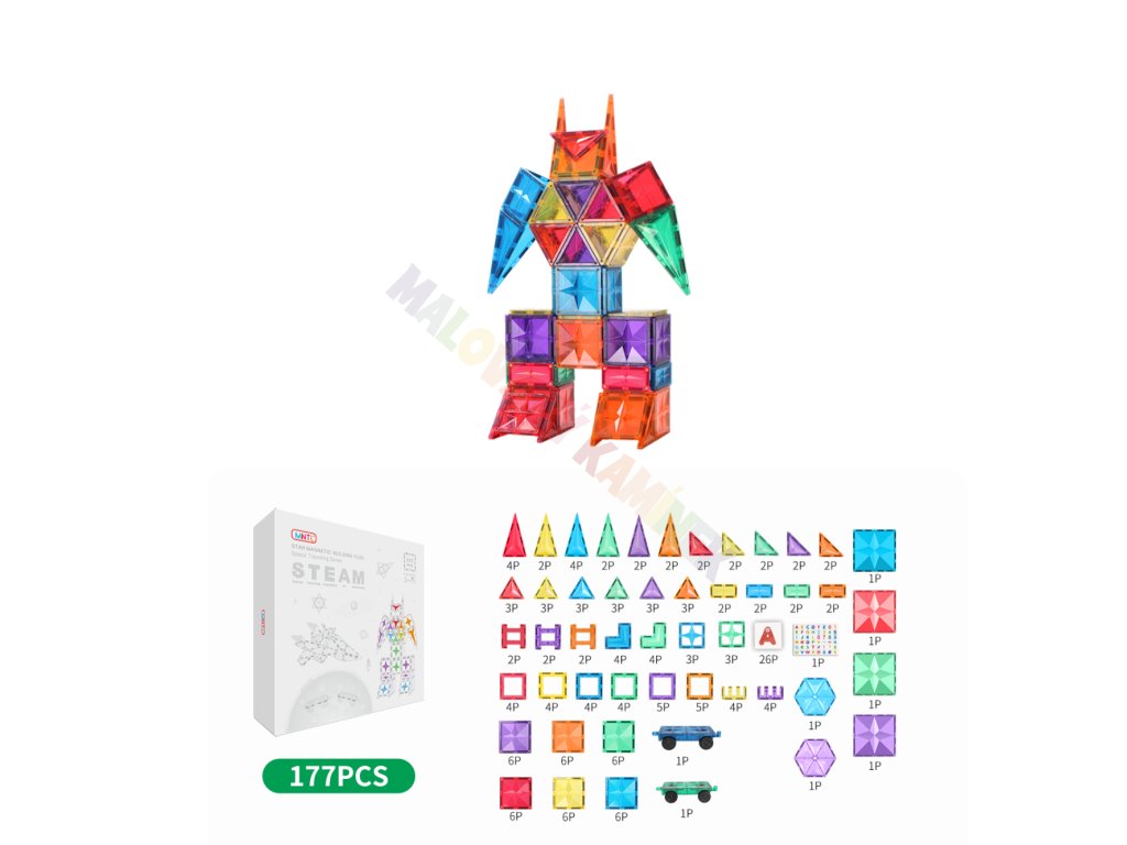 - 177 magnetických dílků v různých tvarech a barvách