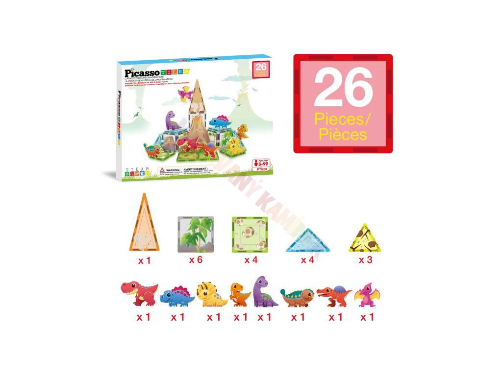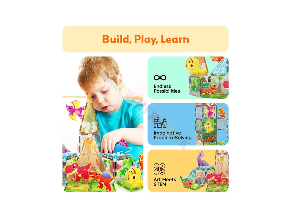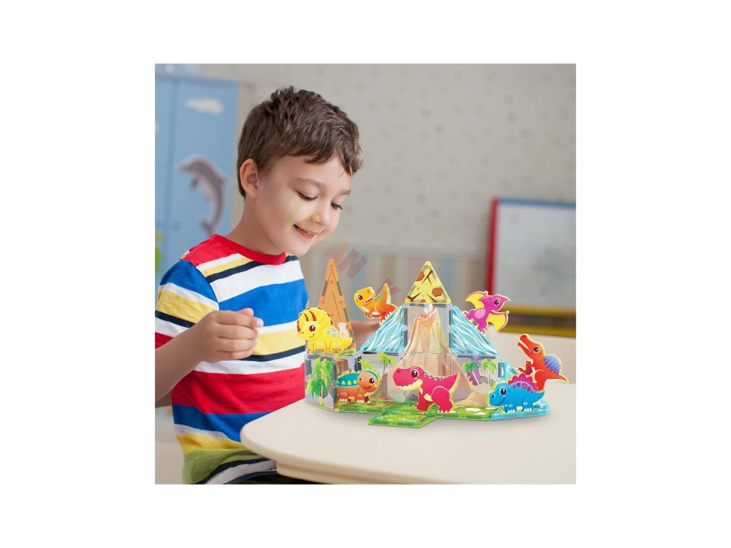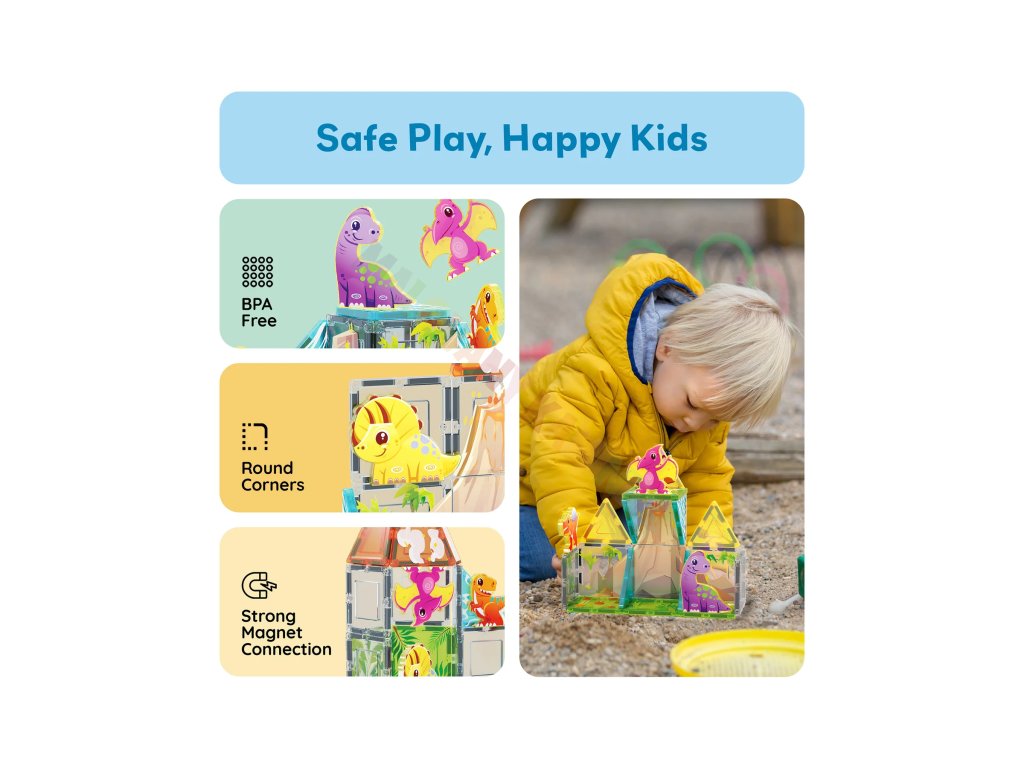 Sada Dinosaur World umožní dětem vytvořit vlastní jurský svět plný dinosaurů. Díky potištěným magnetickým dílkům a osmi dinosauřím figurkám mohou malí stavitelé vytvářet krajiny, vymýšlet příběhy a ponořit se do fantazie plné akce i zábavného poznávání.