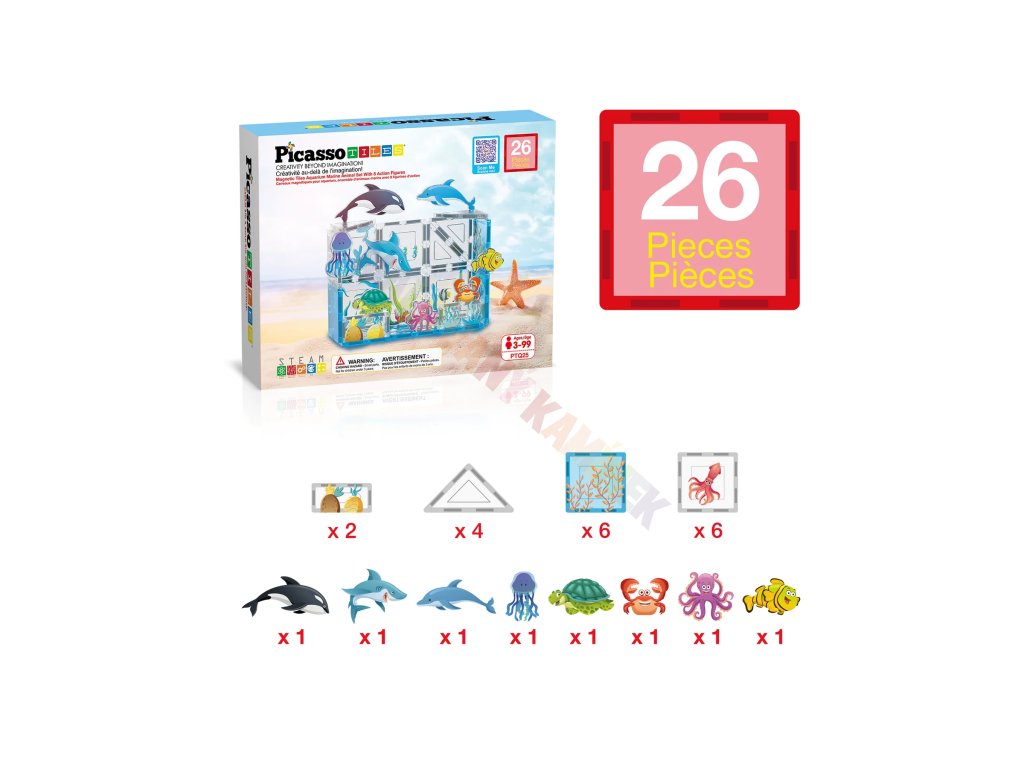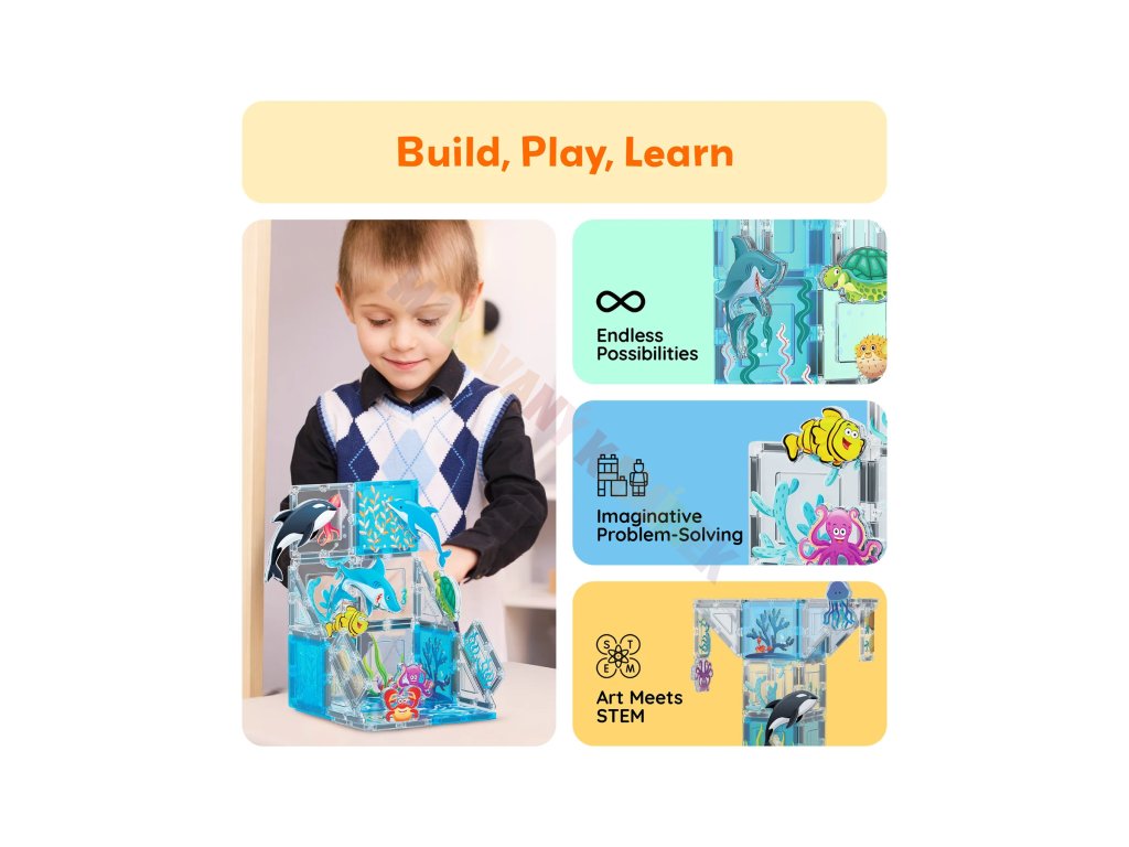 Sada Mořský svět přináší potištěné magnetické dílky a 8 figurek mořských živočichů, se kterými si děti mohou vytvořit vlastní akvárium nebo podmořskou scénu plnou fantazie.