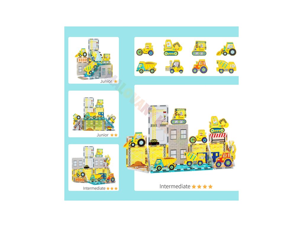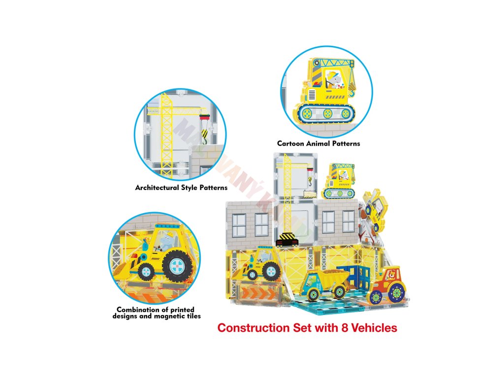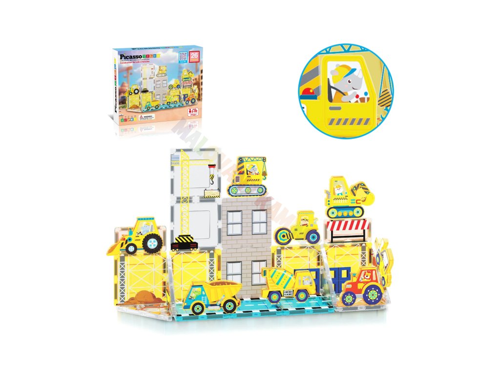 Sada Staveniště přináší magnetické dílky s realistickým potiskem a kolekci stavebních vozidel, díky kterým si děti mohou vytvořit vlastní rušné staveniště plné bagrů, jeřábů a dalších silných strojů.