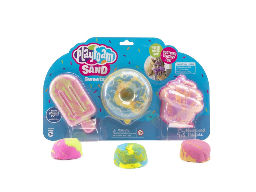 S Playfoam Sand™ si děti mohou užít tvoření, prosévání, třídění, nabírání i tvarování, a to kdekoli a kdykoli. Uzavíratelné formičky ve tvaru pamlsků – nanuků, koblih a košíčků – udrží pískovou směs bezpečně uloženou a připravenou na další hraní. Hmota je měkká, příjemná na dotek a nikdy nevyschne, takže zábava může pokračovat neustále. Ideální aktivita pro rozvoj jemné motoriky a smyslových dovedností dětí.