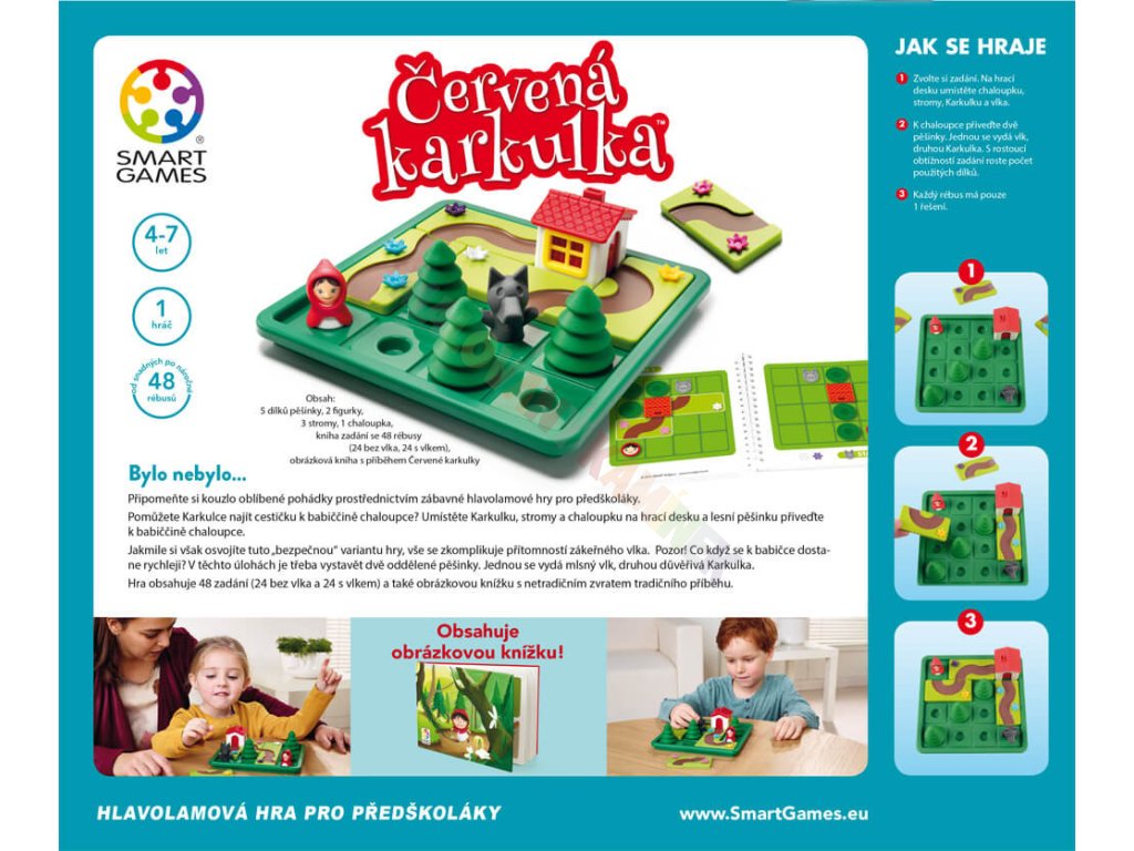 - Obsah balení: 5 dílků pěšinky, 2 figurky (Karkulka, vlk), 3 stromy, 1 chaloupka, Kniha zadání (48 úloh: 24 bez vlka, 24 s vlkem), Obrázková kniha s netradičním zpracováním pohádky o Červené Karkulce