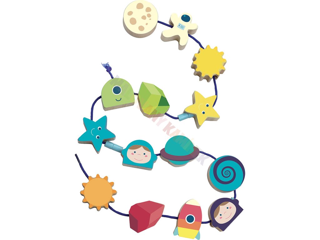Krásná provlékačka v motivu vesmíru. V kompaktním balení najdete 14 ilustrovaných dřevěných korálků (např. astronaut, měsíc, slunce, raketa), které děti mohou navlékat na textilní šňůrku. Hračka pomáhá s rozvojem jemné motoriky. Vybaveno bezpečnostními sponami. Vhodné od 18 měsíců.